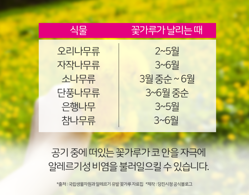 • 바람이 강하게 부는 날은 꽃가루가 공중에 떠다니는 시간이 길어지므로 주의하세요.